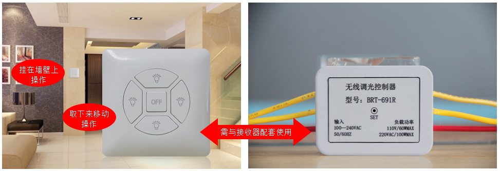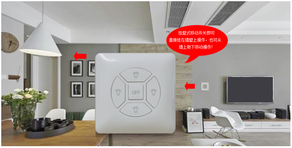 使用时可直接挂在墙壁上操作,也可从墙上取下移动操作,彻底免除新建住宅开关线路的设计和布线,对于旧房改造、二次装修,也不需要重新凿墙开孔、布置开关,可随意将该产品放置于20米内任何位置控制。