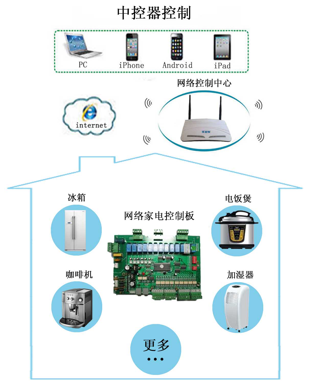 现今,越来越多的人在家里安装路由器,人们对网络概念丝毫不会感到陌生,添加一个可以链接网络的家电非常容易,为家电添加网络控制器后,不论是在家里还是家外,家电设备都和路由器(中控器)链接,并且能够通过因特网被管理和控制。
