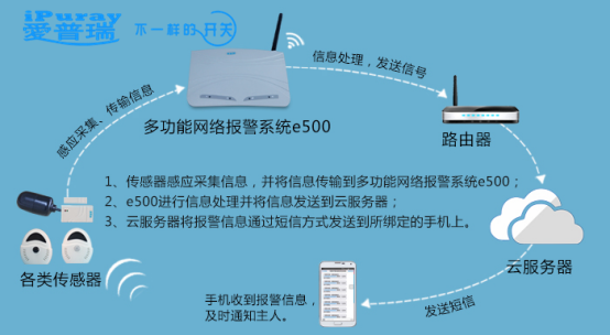 爱普瑞多功能报警平台e500就是基于智能开关的功能上拓展而生,e500是一款能够和多种传感器组合,形成主动示警的多功能网络报警系统,它不仅可实现远程监控,还能在网络故障或状态异常时通过给用户预先捆绑的手机推送短信,实现远程主动报警。