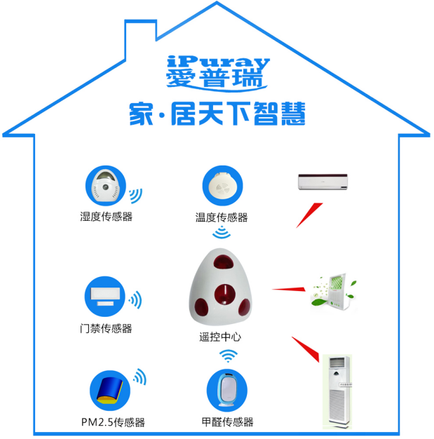 爱普瑞智能家居之环境智能化系统,包含温度湿度感应器、PM2.5 微粒感应器、甲醛CO感应器,红外人体感应器、智能遥控中心、智能家居中控器。您可以利用手机、PC、平板电脑设定屋内温度、湿度、PM2.5微粒、甲醛含量、CO含量等值后,当超过这一值时,智能遥控中心以及智能家居控制器将自动开启相应的设备,如空调、风扇、排气扇、加湿机、抽湿机、空气清新机、空气交换机等,使之屋内空气质量保持在规定的值以内。这是目前最先进、最简单、最方便的环境智能化系统,最大的特点是经济实惠,每个想要安装的家庭都能用得起,“智能行天下,爱普瑞万家”是理想、是目标、更是爱普瑞永远的追求。