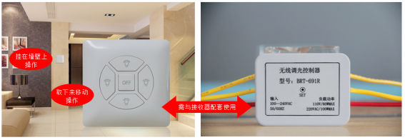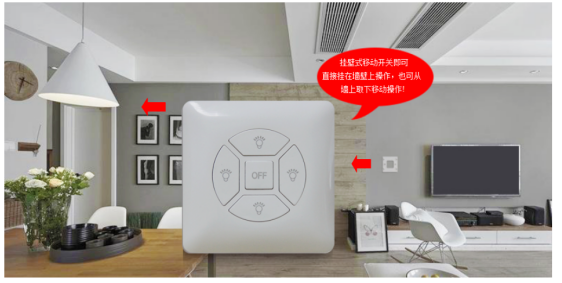 使用时可直接挂在墙壁上操作,也可从墙上取下移动操作,彻底免除新建住宅开关线路的设计和布线,对于旧房改造、二次装修,也不需要重新凿墙开孔、布置开关,可随意将该产品放置于20米内任何位置控制。