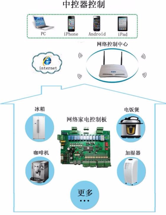 现今,越来越多的人在家里安装路由器,人们对网络概念丝毫不会感到陌生,添加一个可以链接网络的家电非常容易,为家电添加网络控制器后,不论是在家里还是家外,家电设备都和路由器(中控器)链接,并且能够通过因特网被管理和控制。