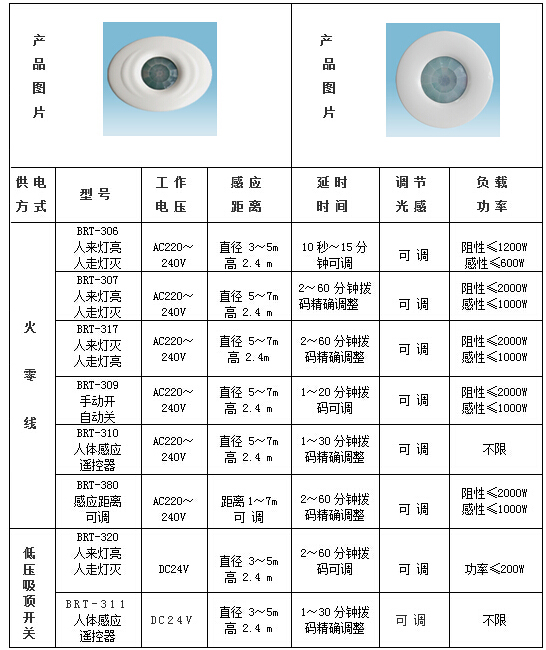 2、吸顶式人体感应开关:指通常用于安装在顶部或天花上的系列人体感应开关,其夹扣式结构可与天花板完美吻合。根据其供电电压的差异,可分为: