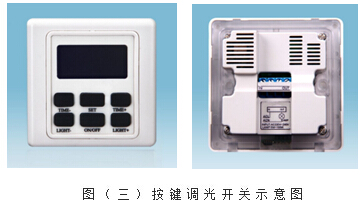 3、按键调光开关:是指在开关面板上安装塑胶按键或软胶按键,用手短按键开/关灯,长按按键调节灯的亮度;或者用手按相应键“ON/OFF”、“UP”、“DOWN”的位置,可开/关灯及调整灯的亮度。