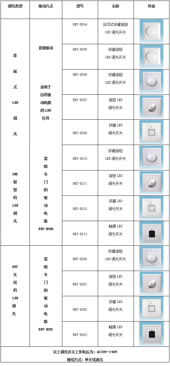 装由于LED灯有潜力巨大的应用前景,带动了LED灯调光开关的迅速发展,现已成为智能型家电开关中最受用户喜爱的系列开关之一。深圳市亚晔实业有限公司从2010年开始致力于该类产品的研发与生产,在调光LED灯无闪烁技术方面有了重大突破。2012年正式推出了爱普瑞LED灯调光开关系列产品,目前已有近二十种产品,包含不同的解决方案及调光方式,填补了LED灯调光开关多种调光方式的空白,例如:智慧码(SMC)LED灯调光开关、无线码(RFC)LED灯调光开关等,给了用户更多的选择,同时满足不同类型LED灯具调光的需求。
