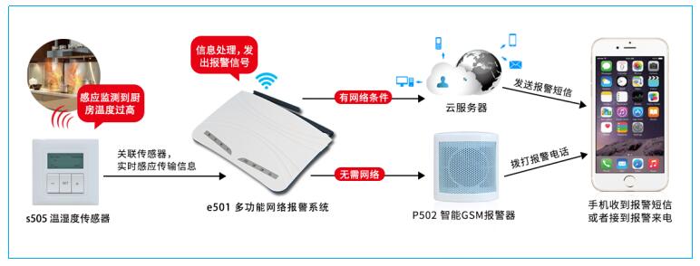 本系统包含1-10个温湿度等多种传感器、多功能报警平台e501及用户手机终端三个部分(GSM模式选配p502)。相对传统的报警系统,其优势如下: