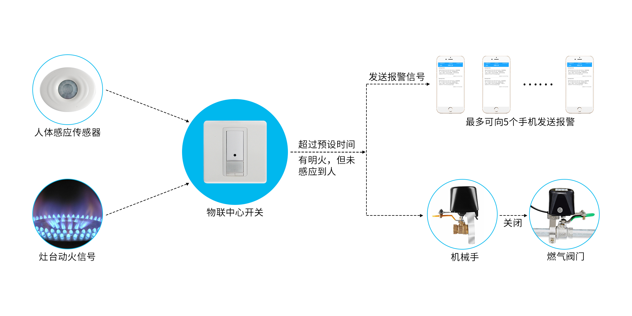 该系统持续对厨房的明火和厨师在岗情况进行监控,如发现明火燃烧时厨师离岗超过预设的时间,系统立刻向多个相关责任人手机进行报警,同时物联中心开关通过对机械手的控制,自动关闭燃气阀门,避免消防安全事故。