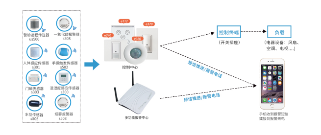 物联开关中高度集成了网关、中央控制器及控制开关,同时可与其他多个控制开关插座组网,不仅可以远程报警,还能自动控制相应的设备进行应急防控。形成安防报警、智能控制的综合系统。